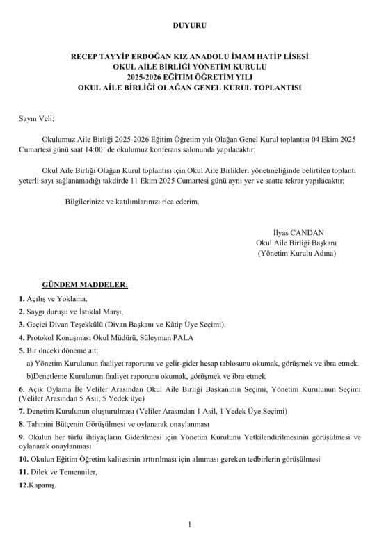 Okul Aile Birliği Olağan Genel Kurul Toplantısı